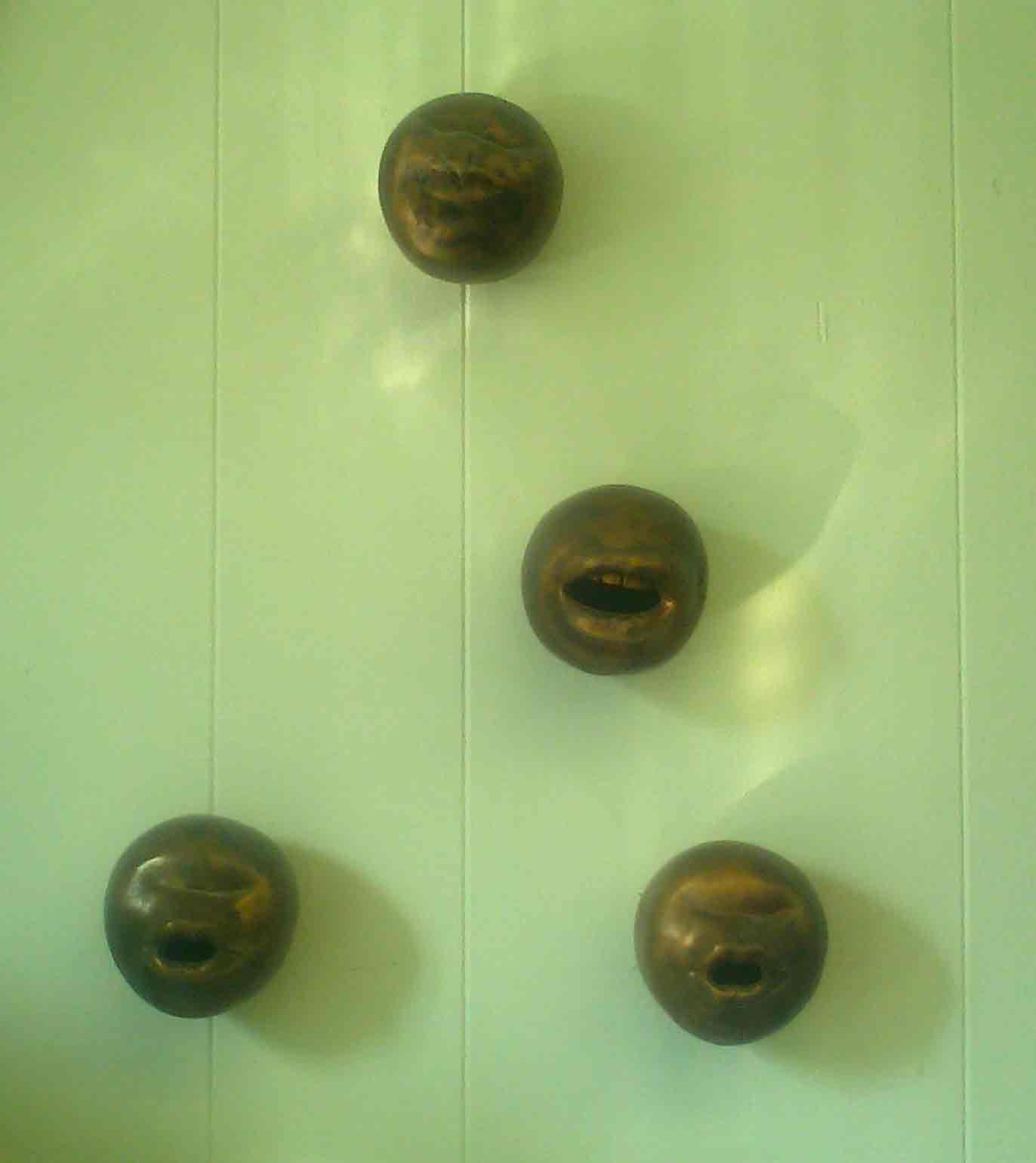 I made this piece my last year of Museum School, Boston. I love this piece. I casted my mouth and sculpted them. It came out strangely funny. My initial idea was hundreds of the mouths on a floor but ended up four on a wall. I took this photo at my work. They are there for sale. I sold first set. This is second set. I hope the mouths of my first set are doing well somewhere in the world.