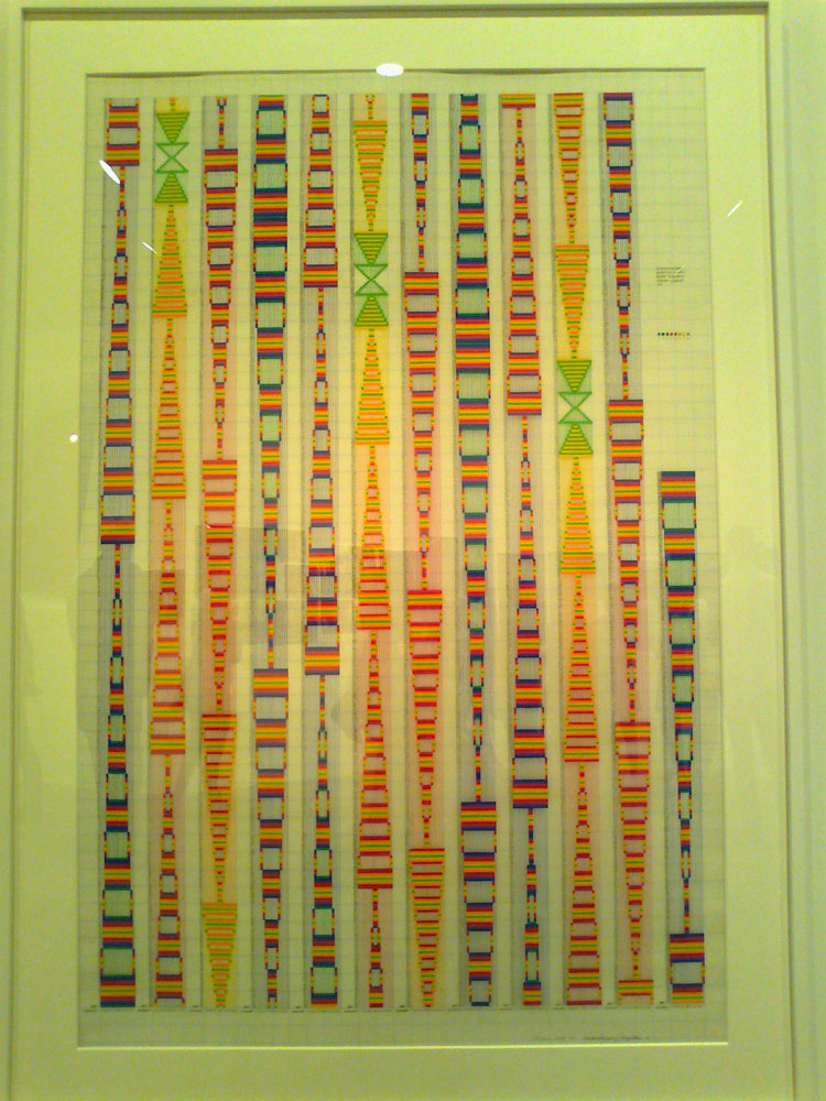 I went to see Whitney Biennial 2014. This is a show-case of American art now. I loved the festive atmosphere of Biennial. But I felt this year’s show doesn’t have enough festivity. It is rather scattered and haphazard. Among 103 artists who are selected for this show, I like Travis Jeppesen’s work. The piece is too big and too sexual so I didn’t take photo. But his work has festivity and craziness. I also like Channa Horwitz’s work and Elijan Burgher’s work. Horwitz’s works are very cool. She made some mathematical formula to apply her painting. Burgher’s work, Bachelor machine, from behind and below (Guyotat version) is lovely small piece. Because colored by color pencils, it’s accessible in spite of its serious subject matter.